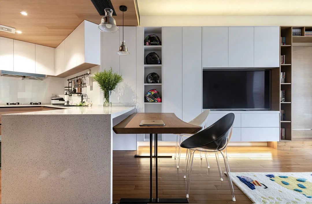 操作台延展出吧台,围塑厨房功能区,同时又可以是餐桌。吧台下方暗含嵌入式餐桌,随时可拉出来扩大餐厅面积。