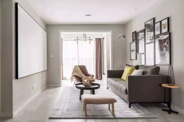 墙面采用水泥灰,搭配灰色的布艺沙发、灰色地毯,背景墙以一组装饰画点缀,打造简单明净的北欧风情。